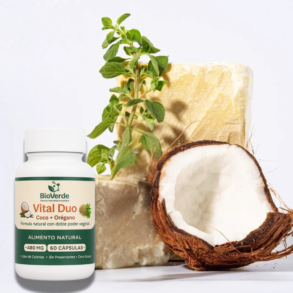 Vital Dúo une el poder del coco y el orégano en una cápsula que limpia, fortalece y protege tu bienestar interior.